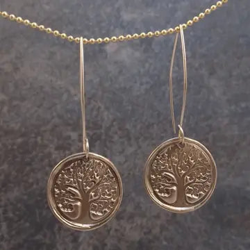 Lightweight and versatile, these Bronze stamped earrings are perfect for daily wear or as a thoughtful, symbolic gift. The pendant is approx, 7/8" diameter, beautifully detailed, and suspended from hand formed 14K gold filled wires. Let them serve as a reminder of resilience, unity, and the beauty of growth, bringing a touch of natural elegance to any outfit.