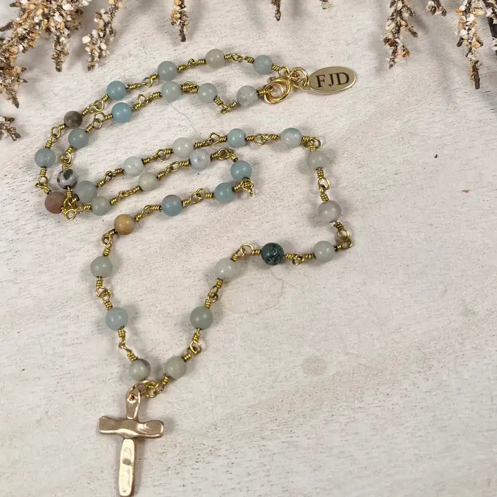 Beautiful and neutral necklace with a handmade Bronze Cross. Each 1 x 1/2 " pendant is hand formed and one of a kind. The cross, which is symbol of faith and grace, is suspended from a series of wire wrapped Amazonite Stones. It has an airy, elegant look and is great casual or dressed up! Get one for yourself, or as a meaningful gift.