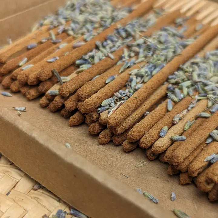 The ONLY ingredients in these incense sticks are ground herbs and wildflowers, makko (an inner bark that works like charcoal to keep everything burning), and acacia gum mixed with water for binding. This "dough" is layered onto raw untreated bamboo sticks by the artisan.