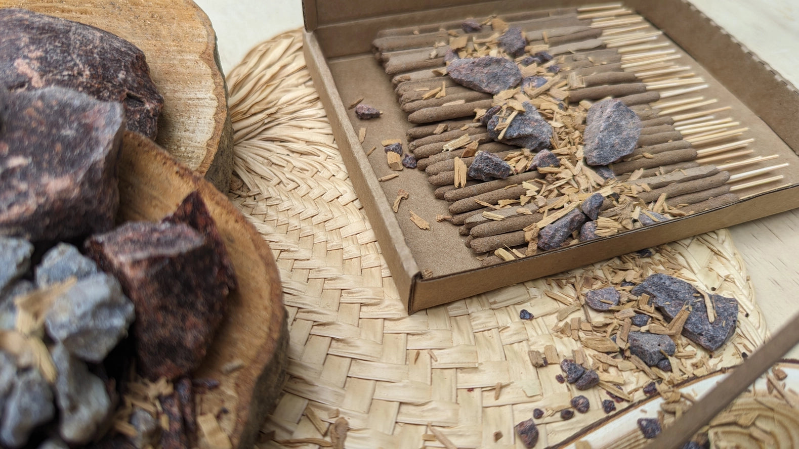 The ONLY ingredients in these incense sticks are ground herbs and wildflowers, makko (an inner bark that works like charcoal to keep everything burning), and acacia gum mixed with water for binding. This "dough" is layered onto raw untreated bamboo sticks by the artisan.