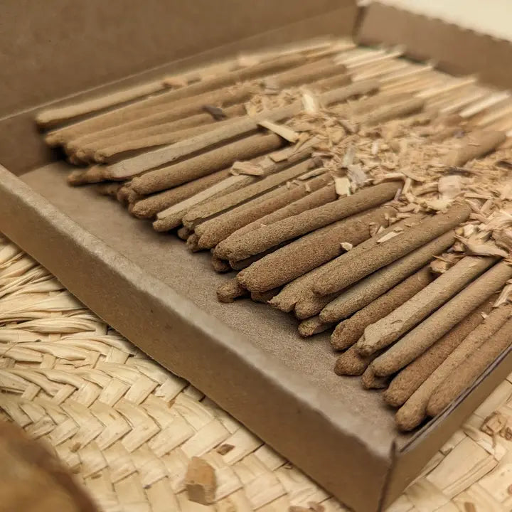 The ONLY ingredients in these incense sticks are ground herbs and wildflowers, makko (an inner bark that works like charcoal to keep everything burning), and acacia gum mixed with water for binding. This "dough" is layered onto raw untreated bamboo sticks by the artisan.