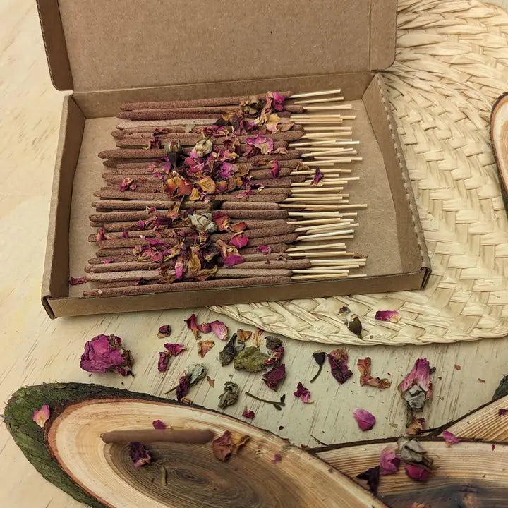 The ONLY ingredients in these incense sticks are ground herbs and wildflowers, makko (an inner bark that works like charcoal to keep everything burning), and acacia gum mixed with water for binding. This "dough" is layered onto raw untreated bamboo sticks by the artisan.